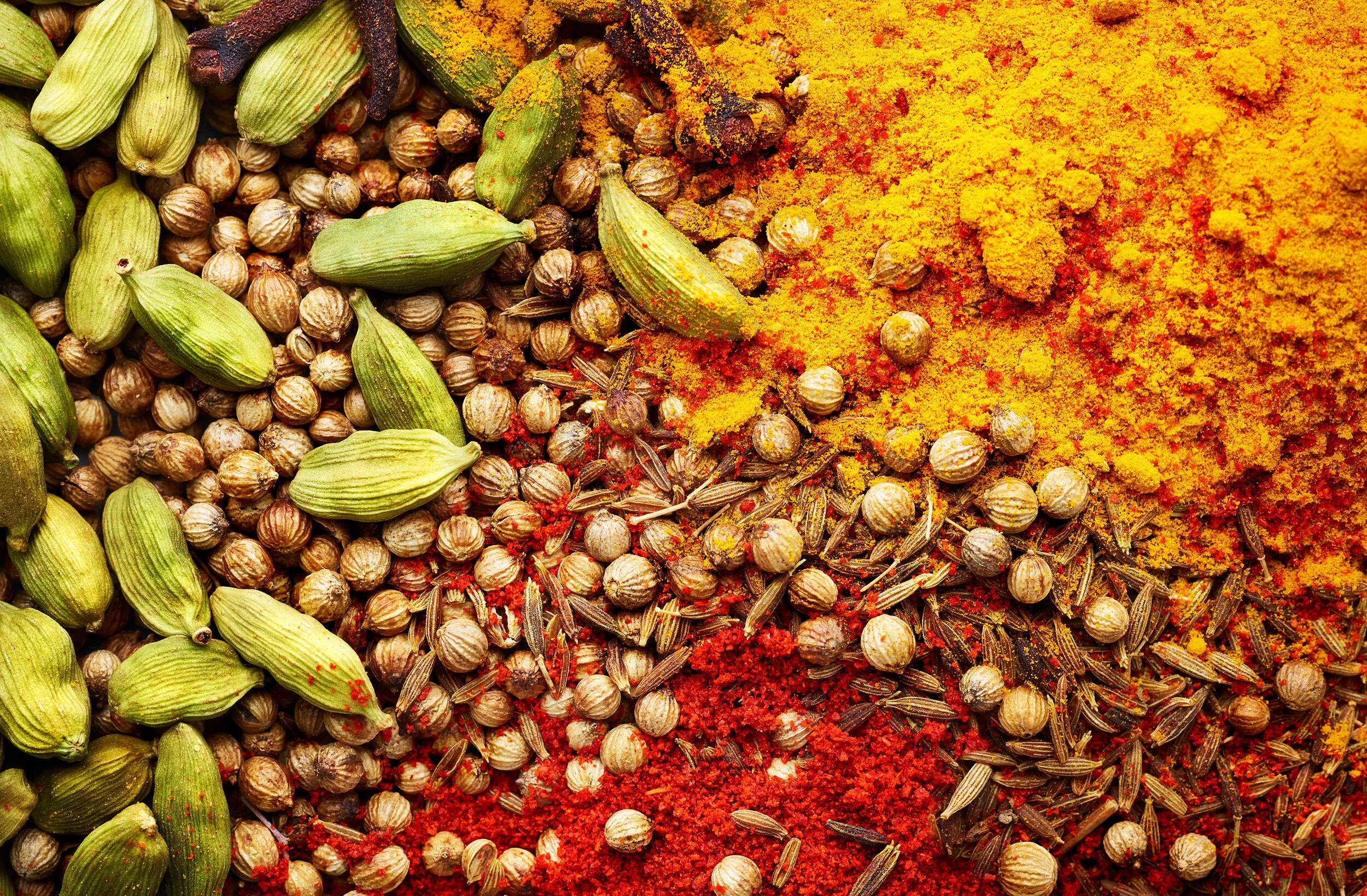 A selection of seeds and spices shot macro and close up. We see cloves, cardomon pods, paprika, turmeric, chilli powder, coriander seeds, fennel seeds, caraway seeds. All the perfect seasonings and spices to make a delicious curry. Food photography b View fullsize