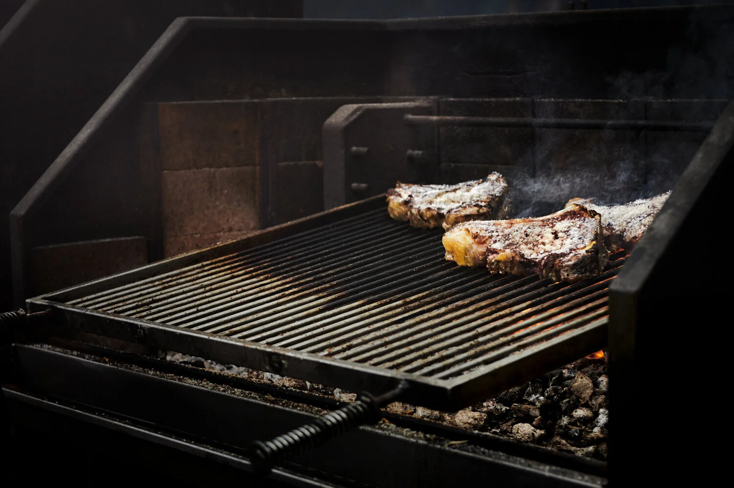 Grilling meat over open flames with hot coals underneath. View fullsize