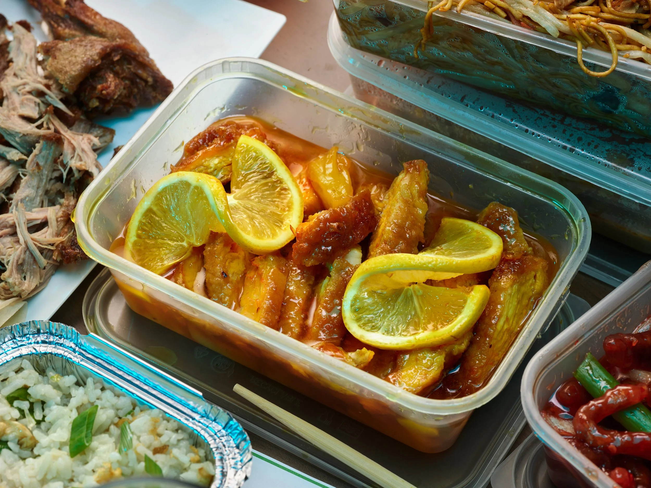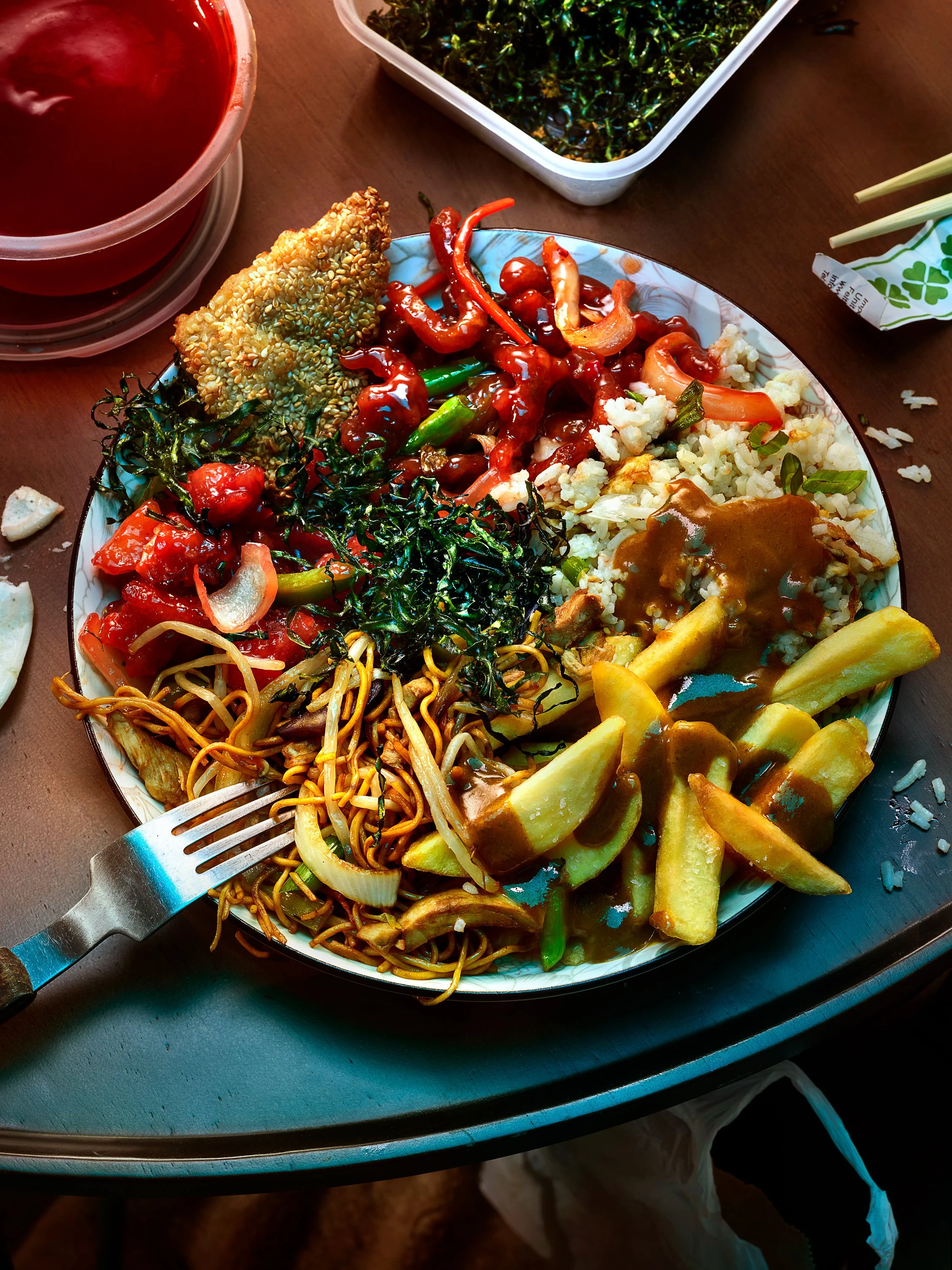 A personal project focusing on the good old British takeaway. This sort of food has become very London centric in its portrayal and I wanted to champion the meals most of the country is eating on a Friday and Saturday night. This sort of Anglo-Chinese is a national staple with ritualistic orders of sweet orange sauces.